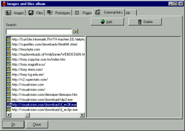 The internal album/collection. You can search, edit, replace, delete hypertext objects, such images, Internet links, pages and more. For example when you replace a link here, it is replaced globally!
